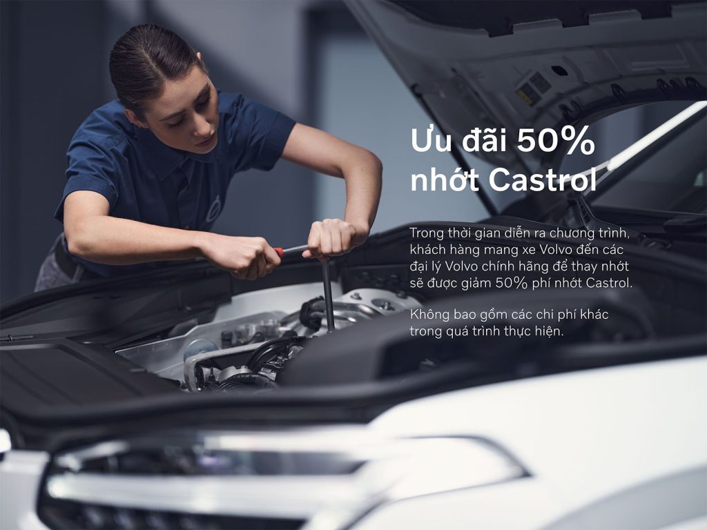 Trong thời gian diễn ra chương trình, Quý khách hàng mang xe Volvo đến các Đại lý Volvo chính hãng để thay nhớt sẽ được giảm 50% phí nhớt Castrol*.