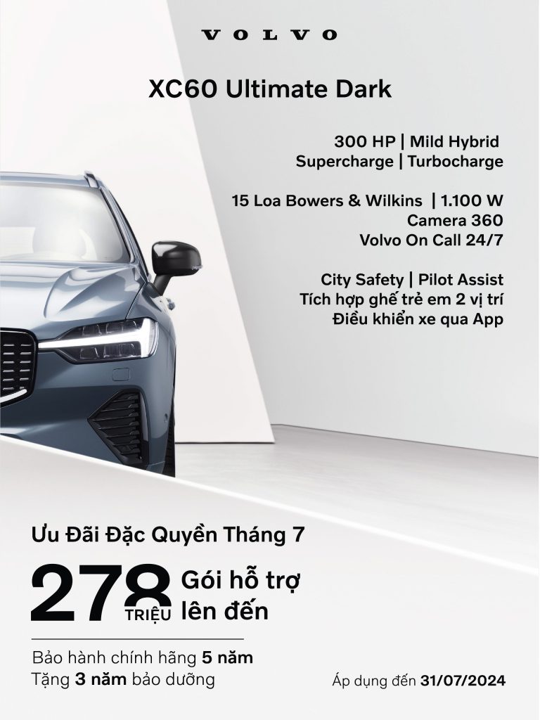 Từ nay đến 31/07/2024, Quý khách hàng sở hữu xe Volvo XC60 sẽ được nhận Gói ưu đãi cực kỳ giá trị, bao gồm: